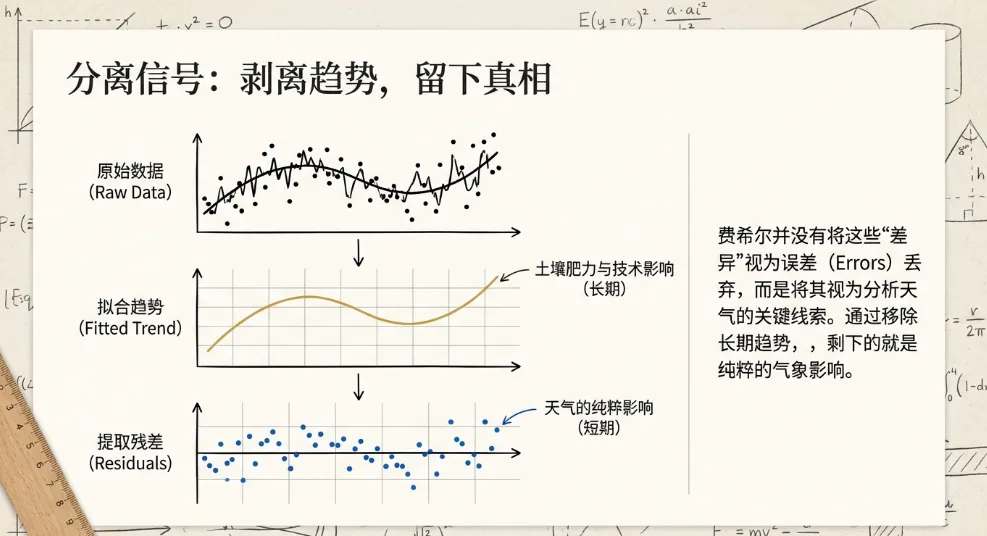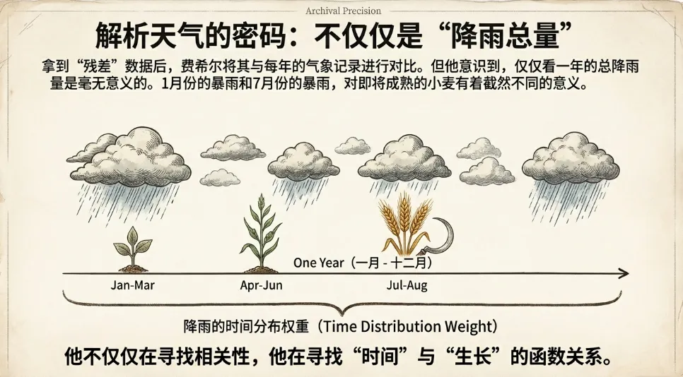 * **相关性分析**:在分离出长期趋势后,费希尔将剩余的“残差”与每年的气象数据(降雨量等)进行对比。* **发现**:他不仅分析了总降雨量的影响,还通过类似的数学技巧,分析了降雨在一年中**不同时间分布**对产量的影响。他得出了精确的结论:某些特定月份的降雨对小麦是有害的,而其他时间则是有益的。4. 费希尔的工作风格