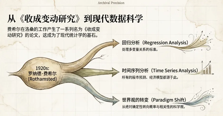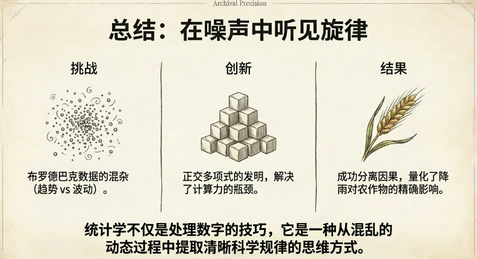 * 本章通过这个案例展示了费希尔典型的科研风格:他不仅仅是应用已有的数学公式,而是为了解决眼前具体的科学问题(如“怎么算小麦产量”),重新发明了所需的数学工具(心里默默一惊)。* 这一系列名为《收成变动研究》的论文,确立了他在处理复杂、含噪声数据方面的权威地位,也为现代的**回归分析**和**时间序列分析**奠定了基础。第五章讲述了费希尔如何运用高超的数学技巧(特别是**正交多项式**)从混乱的农业历史数据中提取出清晰的科学规律。这不仅解决了洛桑实验站的具体问题,更重要的是向科学界展示了:统计学不仅能处理简单的实验对比,还能从复杂的动态过程中分离出关键的因果关系。