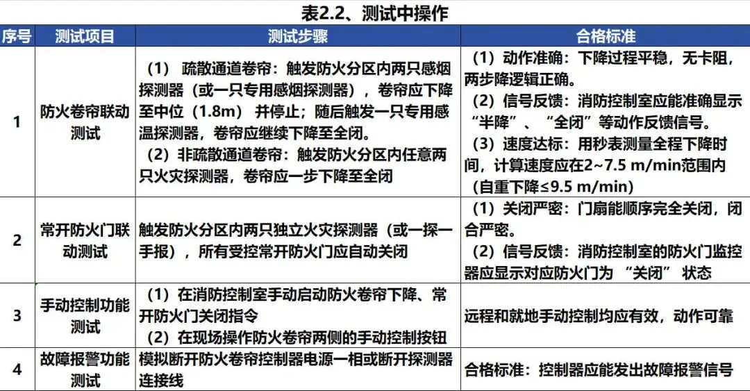 测试前清场,测试中专人监护,防止卷帘下降或门扇关闭时夹伤人员或损坏物品。测试后务必使系统恢复至正常待命状态。
