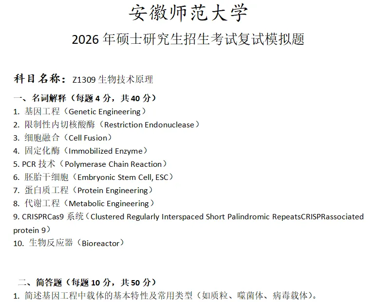 >安徽师范大学Z1309生物技术原理考研复试真题模拟
