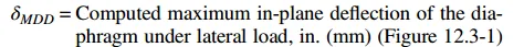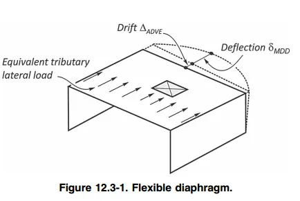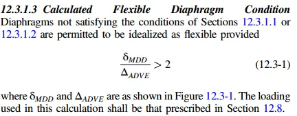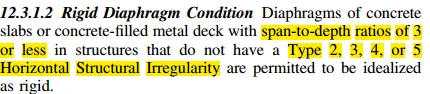 12.3.1.2当无不规则性(不存在type2,3,4,5水平不规则情况下)的混凝土隔板或组合隔板,同时满足跨度/厚度≤3,其中这个ratio不超过3其实很严格很难实现,不满足就得按12.3.1.3进行柔性刚性半刚性判断计算。