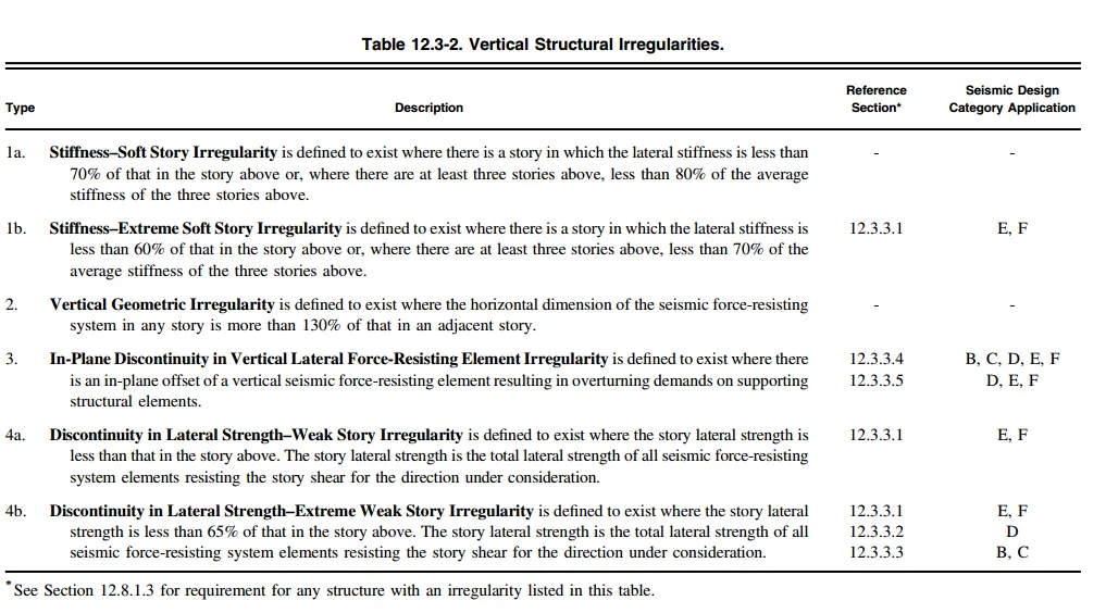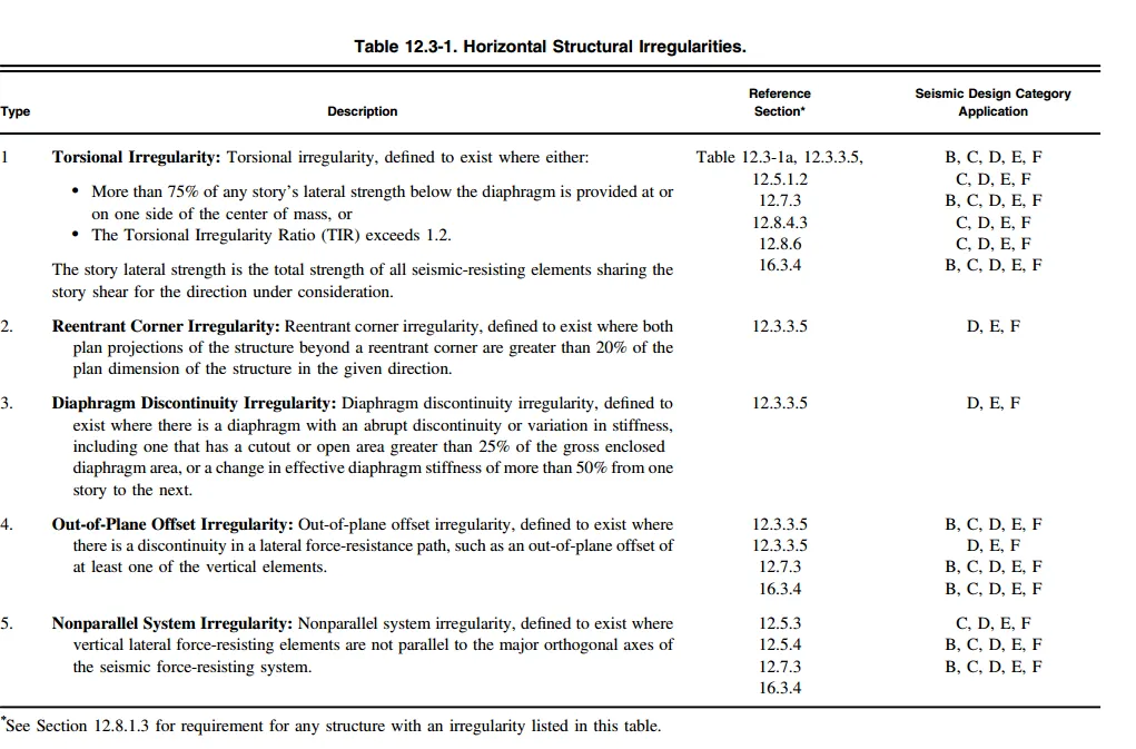 12.3.2隔板的类型对不规则性的判定有着重要的影响。不规则性也就是水平不规则TABLE12.3-1和竖向不规则TABLE12.3-2。