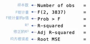 F统计量的P值:P值(越小越好)<α,则可视为,在α水平下认为自变量联合对因变量有显著影响,即模型整体显著。α常用值为1%、5%、10%。——P值=0.000,模型整体显著,则拒绝原假设H0,认为x对y有显著影响(一元线性);当是多元线性回归时,证明回归模型有意义,说明至少有一个X会对因变量Y产生影响。