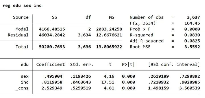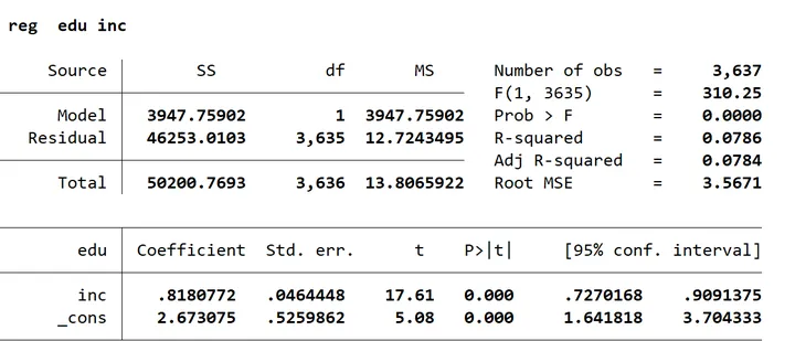 R²=0.0784,即家庭年收入约可解释受教育年限7.8%的变动。——(希望能看懂)