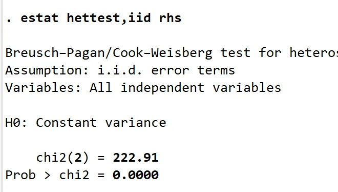 estat hettest,iid rhs //estat是估计后的统计量,iid表示仅假定数据位iid,而无需正态假定。rhs表示方程右边的全部解释变量进行辅助回归,默认使用拟合值进行。