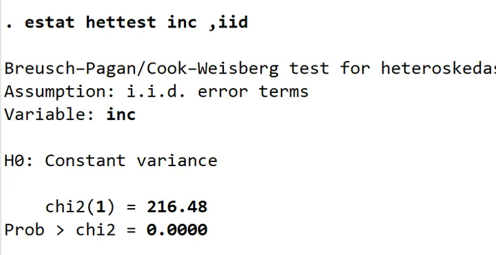 estat hettest,iid //使用拟合值进行BP检验*使用所有解释变量进行BP检验
