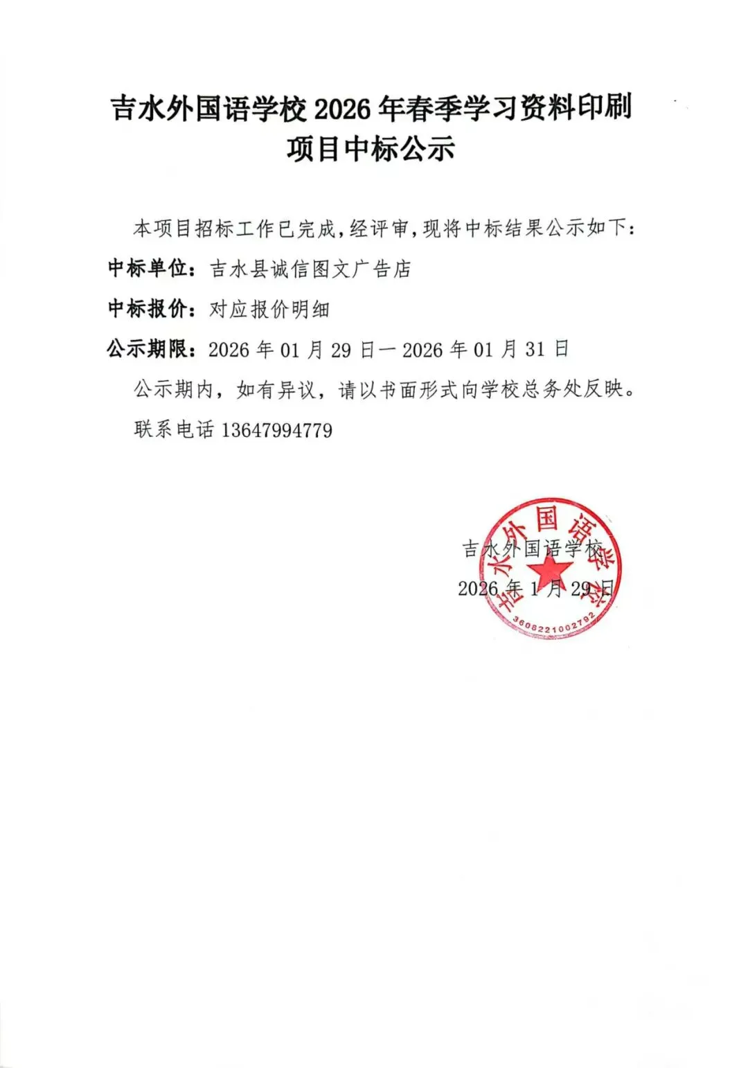 >关于吉水外国语学校2026年春季学习资料印刷项目中标公示