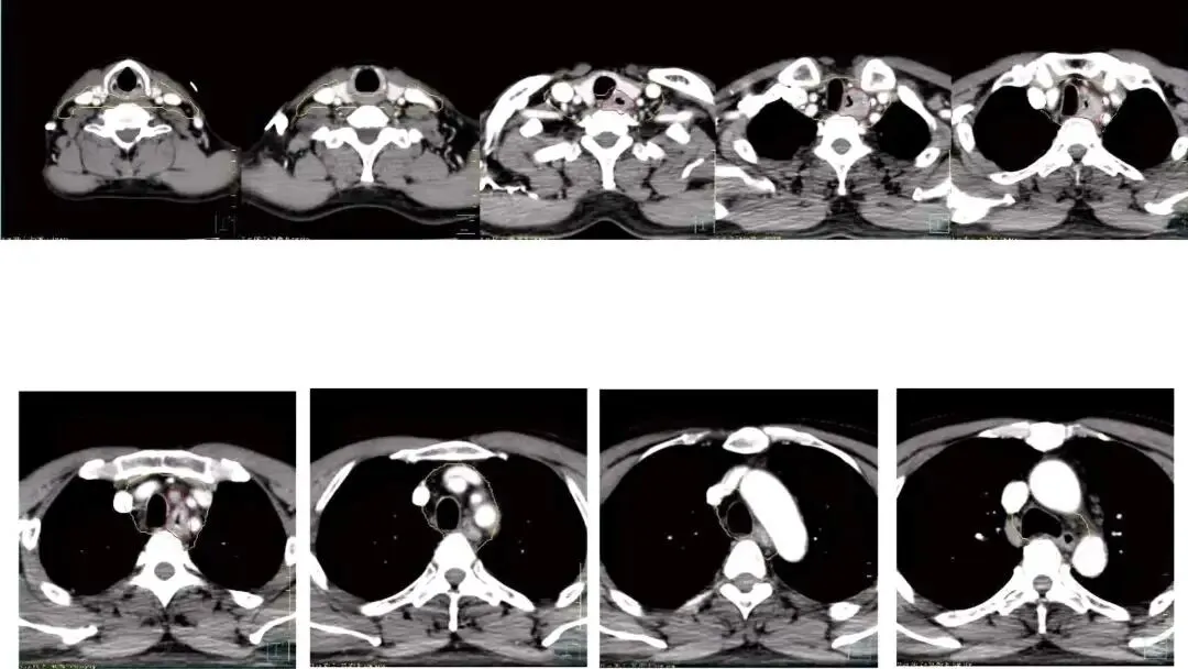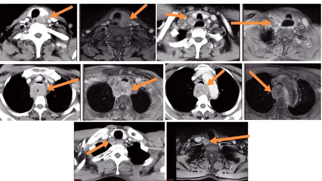 影像学:采用CT+MRI进行双重影像学评估,全面了解肿瘤范围、与周围组织(如喉、下咽、甲状腺)的关系及淋巴结转移情况。