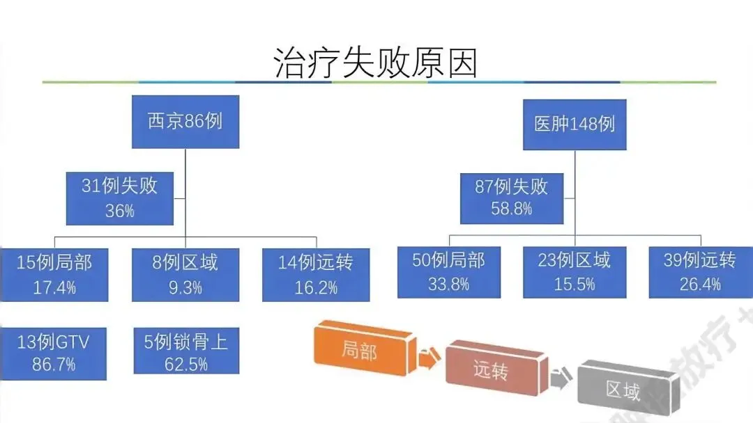1. 主要失败模式:治疗的主要失败原因是局部未控和复发(单纯放疗组可达71%),其次是淋巴结转移和远处转移。