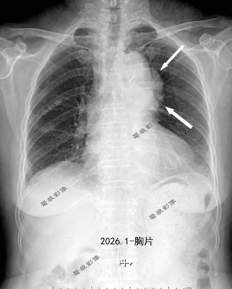 2.左前上纵隔软组织肿块,考虑胸腺瘤,必要时进一步检查以除外其它肿瘤性病变。