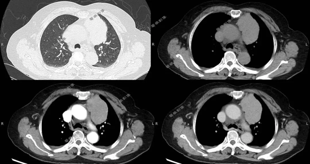 胸内甲状腺肿常见于成年女性,与颈部甲状腺相连,增强扫描明显强化,密度高于肌肉组织,可伴有钙化、囊变或出血,部分患者有甲状腺功能异常表现。