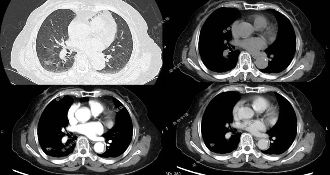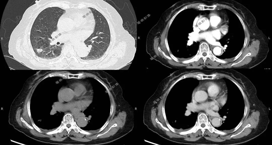 右肺下叶背段(IM118)见一浅分叶状实性结节,大小约为17mm×14mm,病灶边缘可见多发短毛刺,邻近斜裂稍凹陷,增强扫描病灶呈较明显不均匀强化。左前上纵隔见一类圆形软组织肿块,边界尚清,大小约69mm×44mm×51mm,密度较均匀,增强扫描病灶呈较均匀性轻度强化。