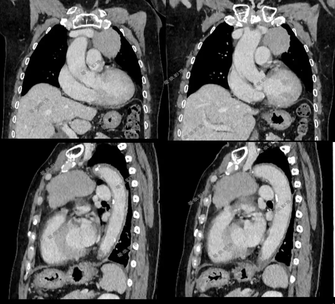 侵袭性胸腺瘤:肿块形态不规则,边缘分叶明显,密度不均匀,常伴有囊变、坏死及斑点状钙化。周围脂肪间隙模糊或消失,可侵犯纵隔胸膜、心包或大血管,出现胸腔或心包积液,增强扫描强化不均匀。