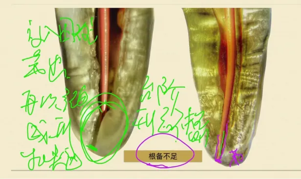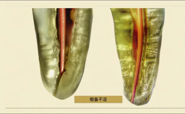我们临床上在做热牙胶充填的时候,我们的主尖可能不容易卡到尖端,或者是不容易到达我们的根尖孔的位置上,那可能是由于我们的根备不足或者是有台阶,或者是根尖区的预备形态不规则,这些都是有可能可能的。所以说遇到这样的情况的时候,当你的主尖放入困难,或者是当你在根充的时候容易带出的时候,你就要考虑考虑你的预备也存在着问题,需不需要再次的一个预备成型,这种再次的预备成型主要针对于根尖的一个再次的预备和成型,成型好之后让我们的主尖能够紧紧的卡到我们的根尖去,让我们的牙胶的尖端能我们跟根管口的尖端有一个很好好的匹配性。