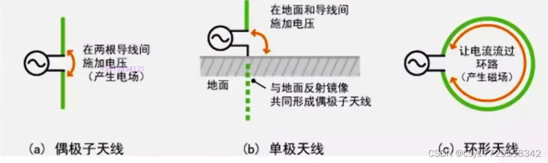 电磁波辐射条件:变化的电压、电流 辐射天线