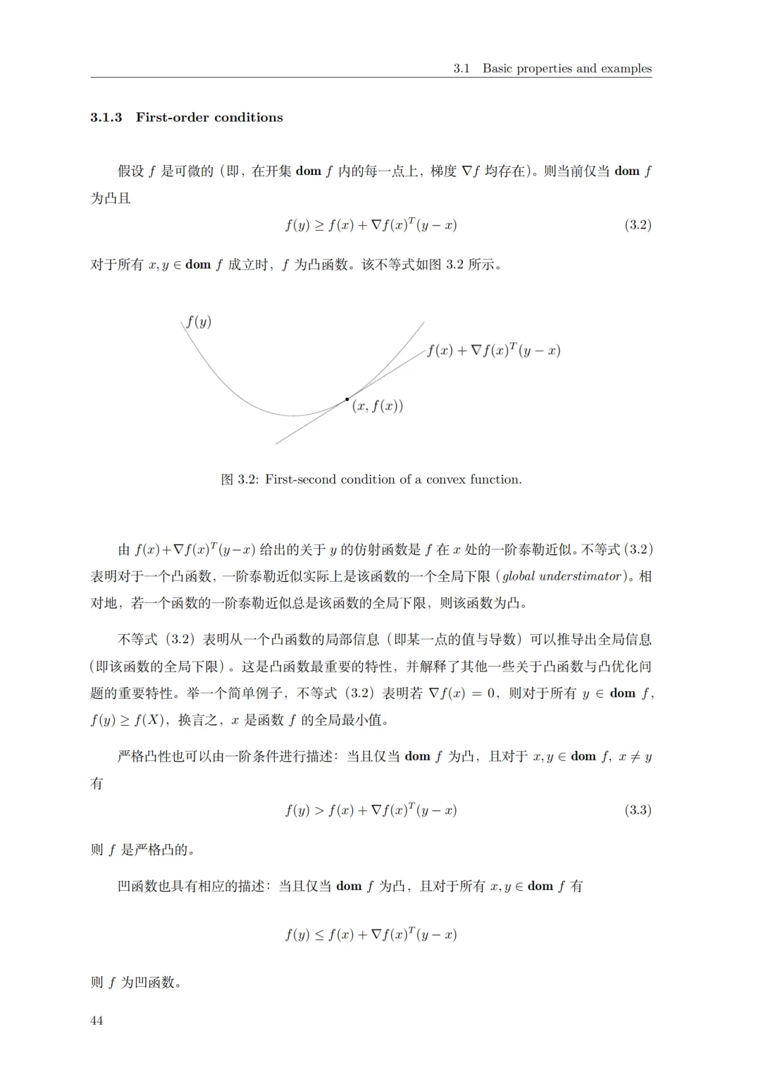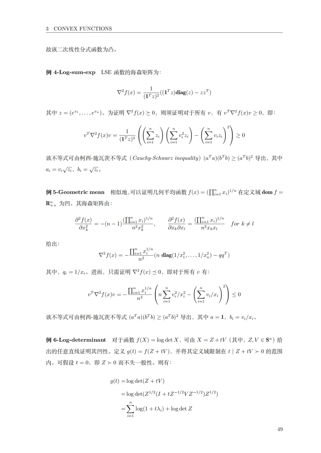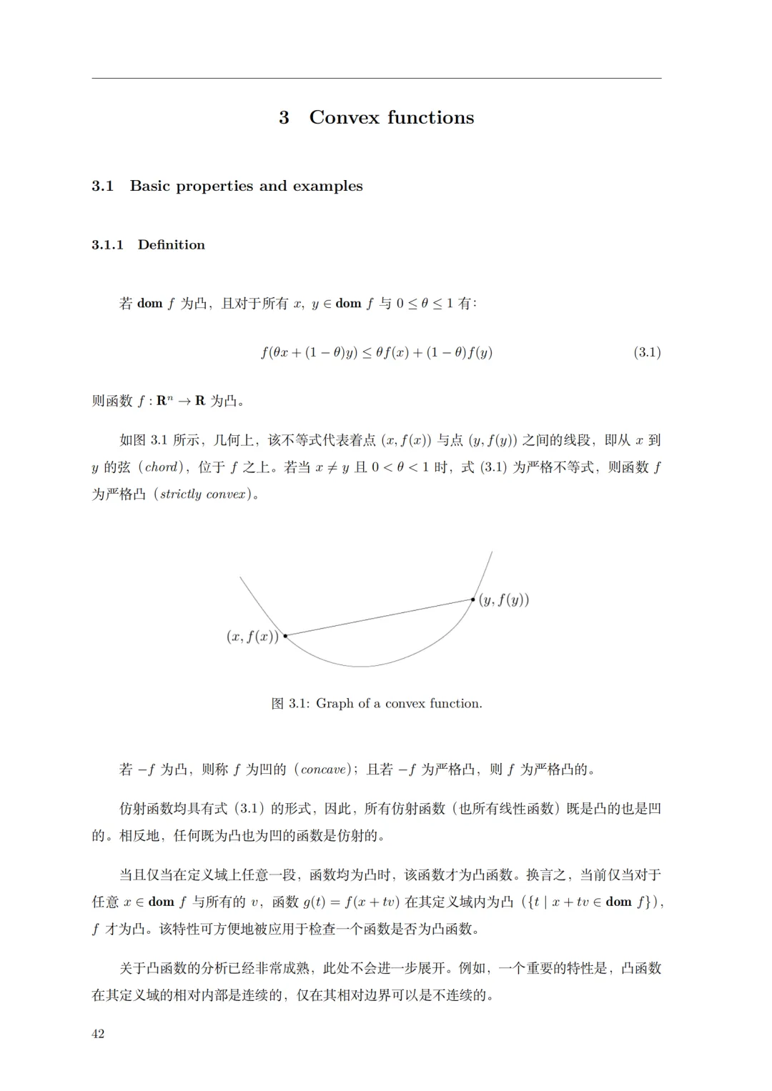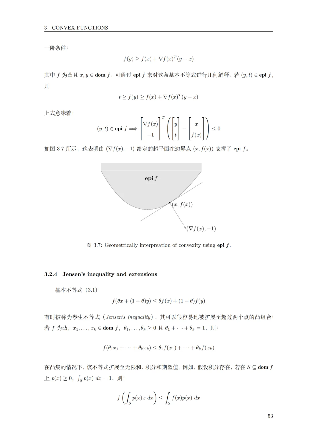本文为凸优化学习笔记的第五部分,包含Boyd《凸优化》3.1的内容。主要内容分为三部分,一部分围绕凸函数的基本定义展开,介绍了扩充实值函数、凸函数的一阶条件与二阶条件,同时给出了许多常见凸函数的例子并进行了证明;第二部分从几何角度对凸函数进行刻画,引入了上/下水平集、上/下镜集的概念;第三部分从解析角度对凸函数进行推广,引出了琴生不等式以及许多相关实例。