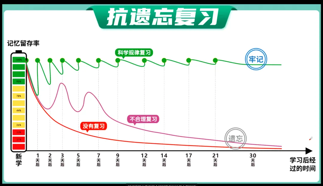 根据艾宾浩斯遗忘曲线的遗忘规律来进行复习。在学习后的第1、2、3、5、7、9、12、14、17、21进行抗遗忘复习。大脑遗忘速度先快后慢,及时复习能将记忆留存率从20%提升到90%。