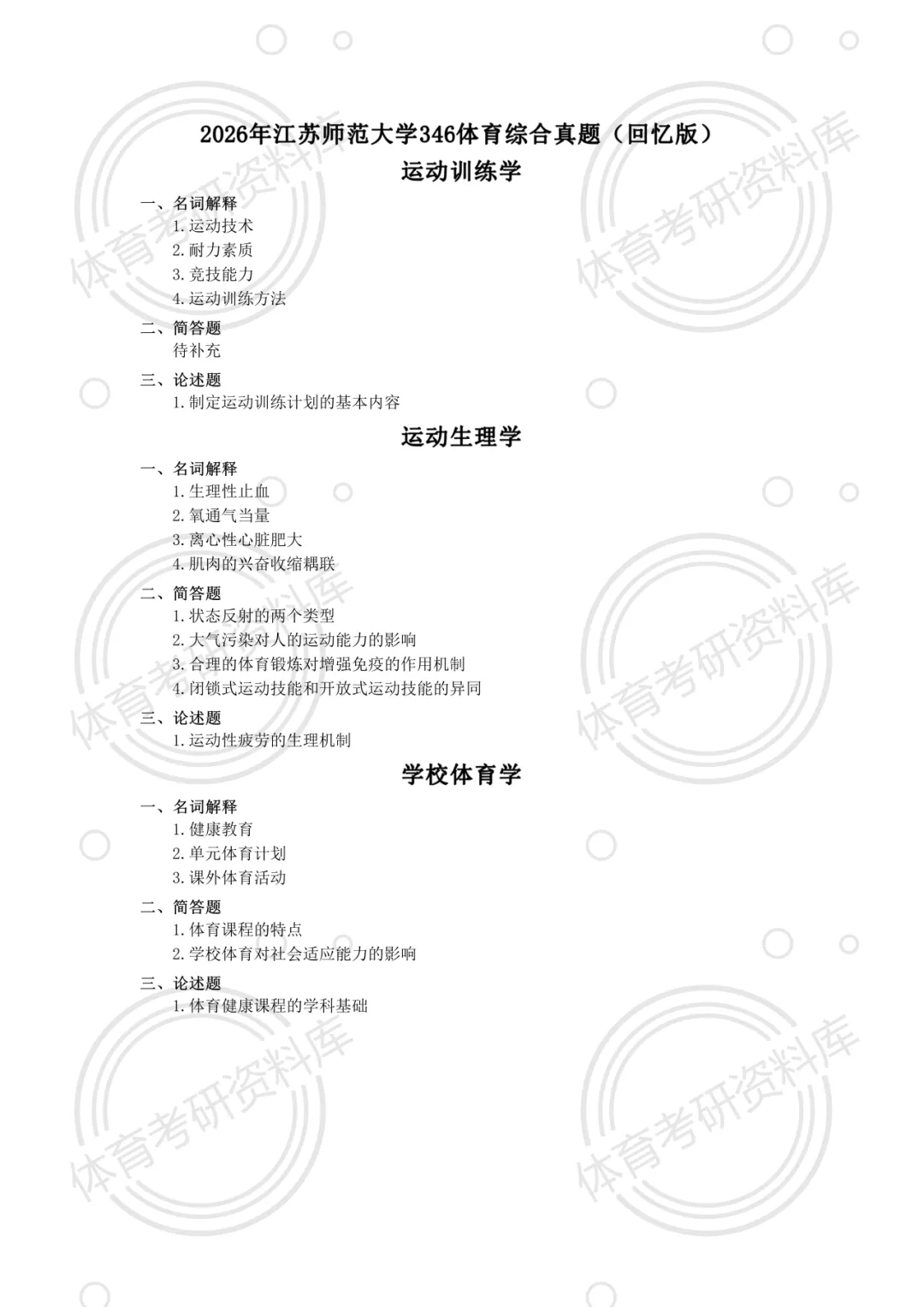 今天给大家分享的是江苏师范大学346体育专硕考研真题考研真题(回忆版)仅供大家学习交流使用