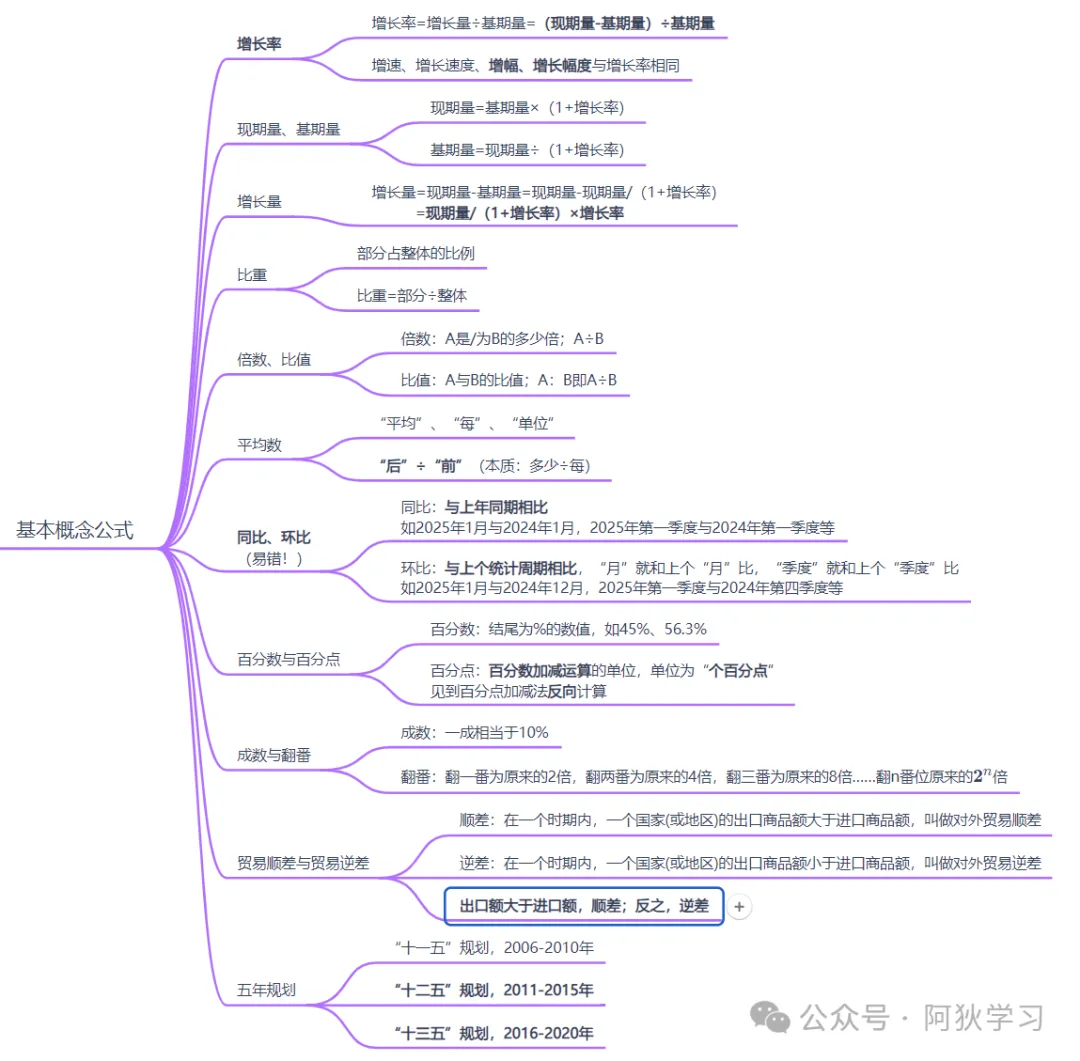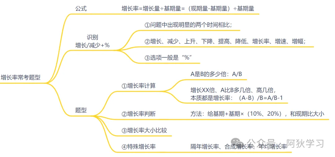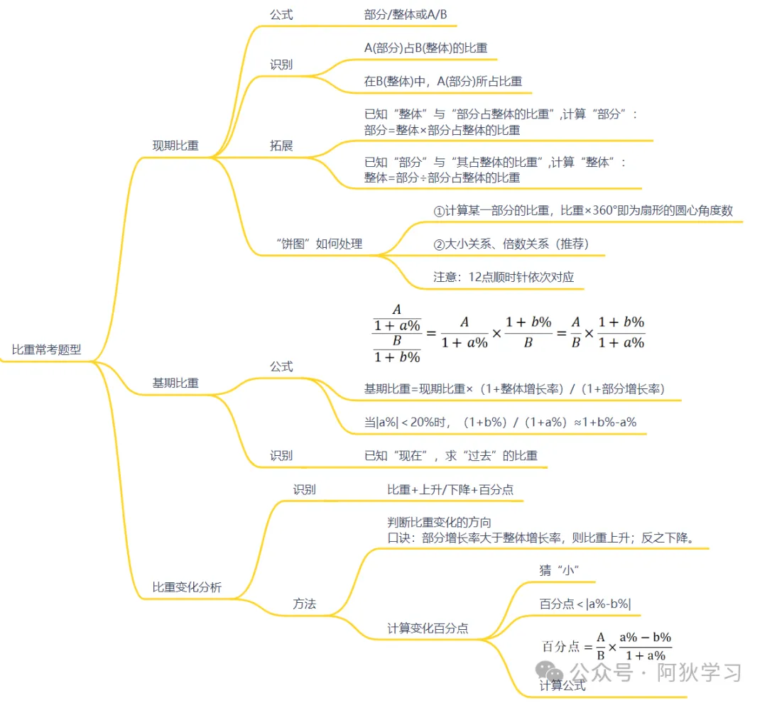 ①判断比重变化的方向:部分增长率大于整体增长率,则比重上升;反之下降。