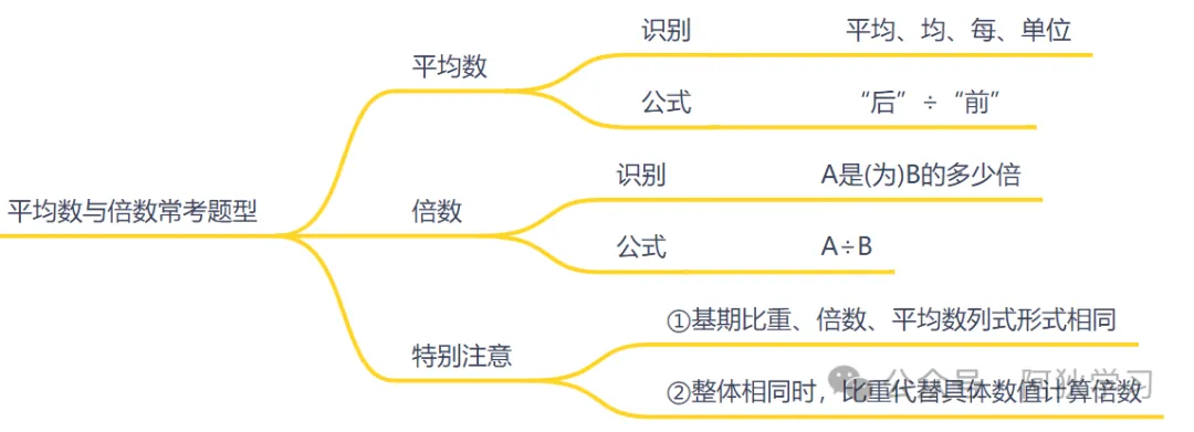 特别注意:①基期比重、倍数、平均数列式形式相同;②整体相同时,比重代替具体数值计算倍数
