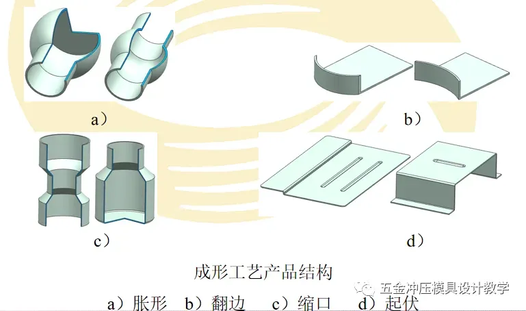 变形工艺中,除应用广泛的弯曲和拉深外,还有一些是通过局部变形方式来改变制件或毛坯形状的,这类工艺统称为成形工艺,例如胀形、翻边、缩口、起伏等。成形工艺往往和其他冲压工艺相组合,成形一些复杂形状的制件,如汽车覆盖件等。