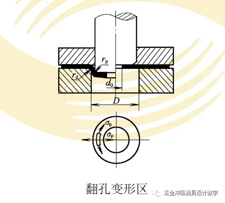 翻孔时,变形区材料的变形情况如图所示。平整坯料上预制有直径为d0的底孔,变形区为D+2Rd-d0的环形部分,随着凸模的下压,孔径将逐渐扩大,靠近凹模口的板料贴紧Rd区后就不再变形,而进入凸模圆角区的板料被反复折弯,最后变为直壁。当全部变为直壁时,翻孔结束。