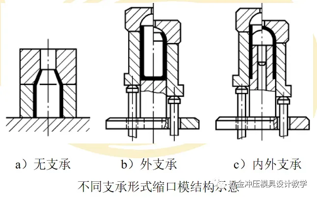 作为使空心或管状制件端部的径向尺寸缩小的成形模,缩口模按支承方式有三种,其结构示意如图所示。