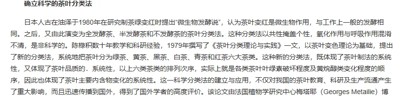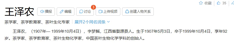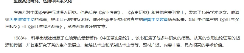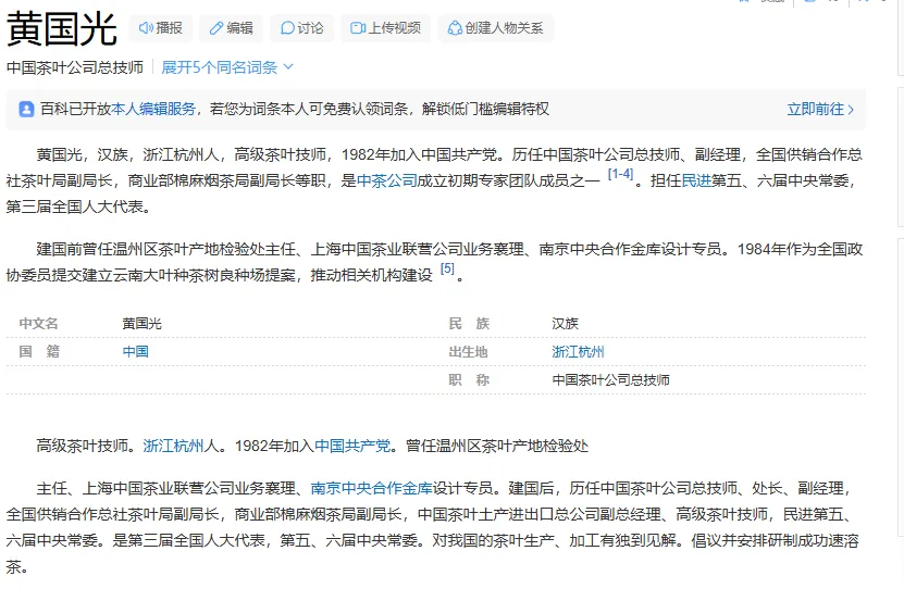 2.又知道一部关于茶叶历史的著作:国内外第一部茶史专著《茶业通史》。黄国光老师的百度百科,都没有前面四位老师的“百度百科”长;
