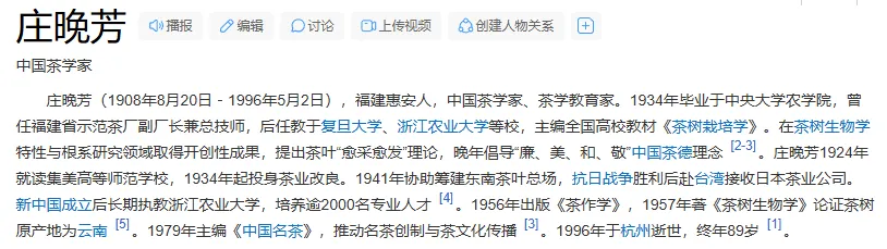 王泽农老师的百度百科,我截取了开头的一段,分享给大家;王泽农,(1907年— 1999年10月4日),字梦鳐,江西省婺源县人。生于1907年5月3日,卒于1999年10月4日,享年92岁。茶学家、茶学教育家、茶叶生物化学家,中国茶叶生物化学学科的创始人。其实介绍茶文化,除了能够从它的文化属性去介绍,也可以从它的科技属性来介绍。因为在我所接触到的茶行业从业者里,大部分都是从茶的文化属性来介绍茶,说茶文化历史多么悠久、底蕴如何深厚,很少有人从茶的科技属性来介绍;这或许也是介绍茶文化的一个切入点。庄晚芳(1908年8月20日-1996年5月2日),福建惠安人,中国茶学家、茶学教育家。1934年毕业于中央大学农学院,曾任福建省示范茶厂副厂长兼总技师,后任教于 复旦大学 、 浙江农业大学 等校,主编全国高校教材《 茶树栽培学 》。在 茶树生物学 特性与根系研究领域取得开创性成果,提出茶叶“愈采愈发”理论,晚年倡导“廉、美、和、敬” 中国茶德 理念 。庄晚芳1924年就读集美高等师范学校,1934年起投身茶业改良。1941年协助筹建东南茶叶总场, 抗日战争 胜利后赴 台湾 接收日本茶业公司。 新中国成立 后长期执教浙江农业大学,培养逾2000名专业人才 。1956年出版《茶作学》,1957年著《茶树生物学》论证茶树原产地为 云南 。1979年主编《 中国名茶 》,推动名茶创制与茶文化传播 [3] 。1996年于 杭州 逝世,终年89岁 。我知道了一本与中国茶史有关的书,作者是庄晚芳老师;吴觉农(1897年 - 1989年),原名荣堂,因立志要献身农业(茶业),故改名觉农,浙江 上虞 人。 [2] 中国知名的爱国民主人士和 社会活动家 ,著名 农学家 、 农业经济学家,现代茶叶事业复兴和发展的奠基人。1949年吴觉农参加了全国政协第一届会议,参与共同纲领的制定,参加了开国大典。 新中国成立 后,他曾担任首任 农业部 副部长、全国政协副秘书长。去世前一直担任全国政协常务委员、 中国农学会 名誉会长、 中国茶叶学会 名誉理事长。1989年10月因病在北京逝世,享年92岁。吴觉农被誉为“当代茶圣 ”,其所著《 茶经述评 》是当今研究 陆羽 《 茶经 》最权威的著作。他还最早论述了中国是 茶树 的原产地,创建了中国第一个高等院校的茶业专业和全国性 茶叶 总公司,又在福建 武夷山 麓首创了茶叶研究所,为发展中国茶叶事业作出了卓越贡献。- 知道了吴觉农老师的《茶经述评》是当今研究陆羽《茶经》最权威的著作。