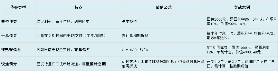 债券估值模型全解析 1. 基本估值模型(核心公式) 债券价值 = 未来各期利息现值 + 到期本金现值 公式:V = I × (P/A, i, n) + M × (P/F, i, n) V:债券价值 I:每期利息(面值×票面利率) M:到期面值 i:折现率(市场利率或必要报酬率) n:剩余期数 2. 四种特殊债券估值模型 不同类型债券估值对比债券类型特点估值公式实战案例典型债券固定利率、每年付息、到期还本基本模型面值1000元,票面利率8%,5年期,市场利率10%,价值=924.16元平息债券利息在到期时间内平均支付(半年/季度)按计息周期折现每半年付息一次,周期利率=报价利率/2,期数=年数×2纯贴现债券到期日前无现金支付,零息债券V = M/(1+i)^n5年期国库券,面值1000元,票面利率12%,单利计息,价值=993.48元流通债券已发行且在二级市场流通,非整数计息期两种方法:①直接非整数期折现;②先算付息日价值再折现已发行3年,剩余2年,估值时点不在付息日,需计算非整数期现值实务应用技巧:遇到非整数计息期的流通债券,推荐使用第二种方法(先算付息日价值再折现),计算更简便且不易出错。