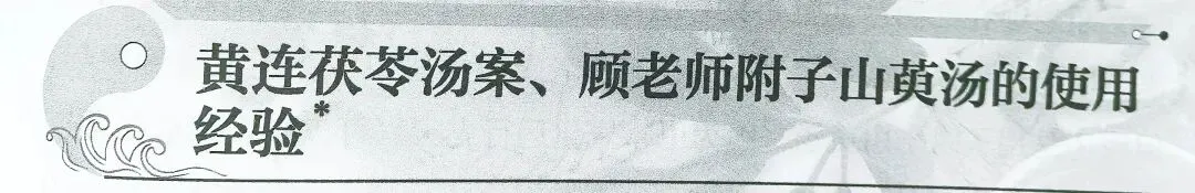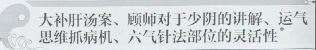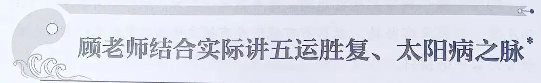 该患者表现的征象可以归纳为火与土,同时有怕冷,舌胖脉沉,也有寒的病象,符合黄连茯苓汤寒胜火郁土复的病机,顾老师同时指出黄连茯苓汤的病机里面太阳寒水是病因,少阴君火是病机,从三阴三阳来分,黄连茯苓汤主治少阴病。这个病例中患者出生并不是丙年,目前也已不在太阳寒水客气中,但顾老师根据病象归纳病机,直接使用了黄连茯苓汤,展示了灵活使用运气思维的范例。
