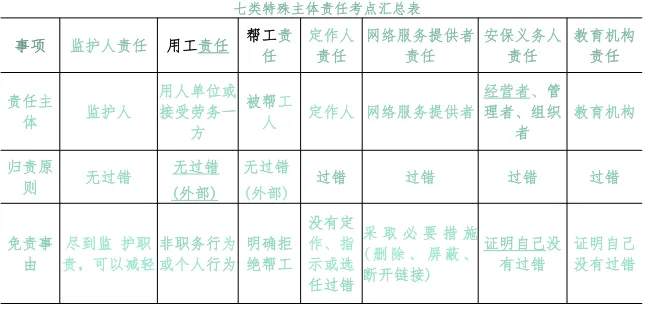 1.责任主体范围:学校、幼儿园或其他教育机构(教师不独立对外担责,教师与教育机构为用工替代责任,由学校替教师对外承担侵权责任)。