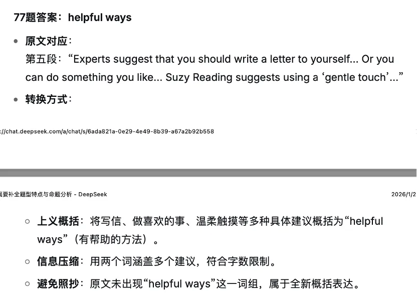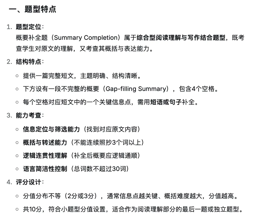 由于概要补全是2025年中考新题型,所以我们以2025中考真题为模板,导入Deepseek,输入以下指令语:“你是一名中考英语命题专家,请学习文件中的题型,并分析这道题的题型特点和命题逻辑。”Deepseek生成以下内容: