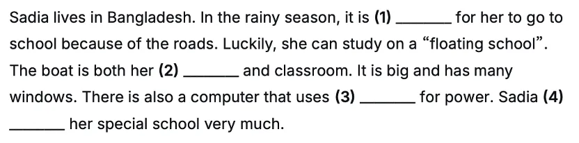 Sadia is a student from Bangladesh. When _____1______, it’s difficult to walk on the roads. At those times, she studies on a floating school. The boat stops at her home to ______2_______. There is one teacher and one class in each boat. The classroom is long and wide. There is a blackboard ______3______ the classroom. Next to it is a computer and it gets power from the sun. She really enjoys studying in this special school because it is _______4______to study here. 第1题的答案为when it rains often/a lot,是原文“in the rainy season” 的同义替换表达,我将简单的词汇同义替换表达改为句型替换表达。 第2题的答案为takes her to school, 考查学生的逻辑推理能力,推断学校接上她后的活动。 第3题的答案是in the front of,是原文 “at the front” 在句中的短语同义表达,考查学生的信息转化能力。 第4题的答案是interesting and convenient。这道题是开放题,是基于原文信息归纳而来的,考查学生的信息归纳能力。 |