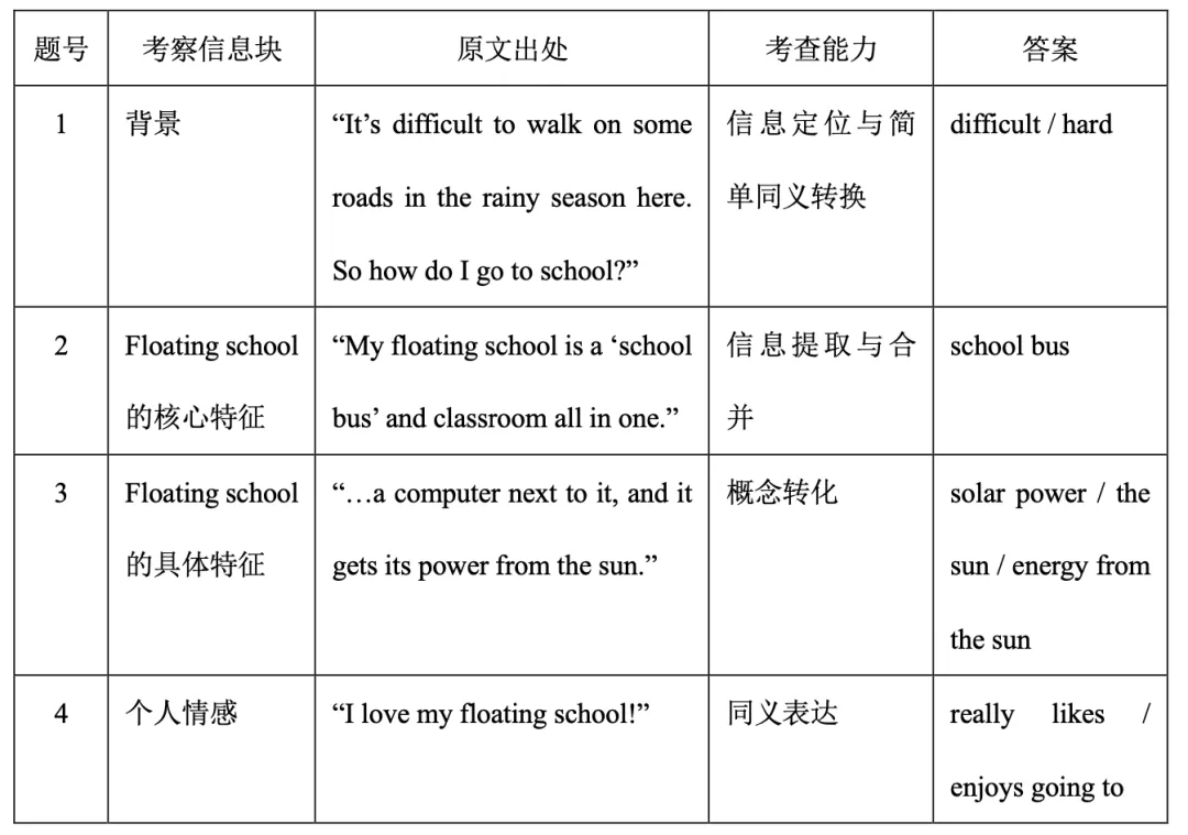 2. 第1、2、4题并不能引导学生对原文信息进行转换,学生可以直接填入文本信息,且符合上下文逻辑。这种情况就只考查了学生的信息提取能力,没有涉及信息整合、归纳等能力。