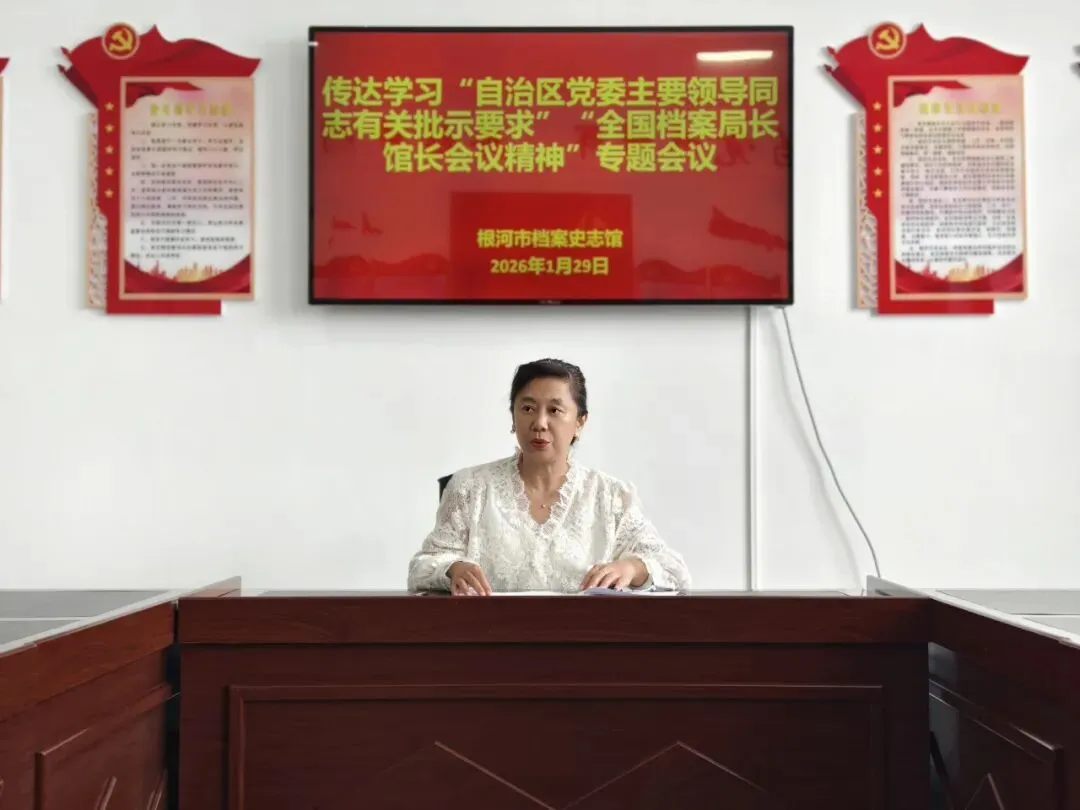 1月29日,根河市档案史志馆召开专题学习会,传达学习2026年全国档案局长馆长会议精神及自治区党委、呼伦贝尔市委对档案工作的批示精神,结合工作实际研究部署贯彻落实举措。黄春英馆长主持会议,馆全体干部职工参加会议。