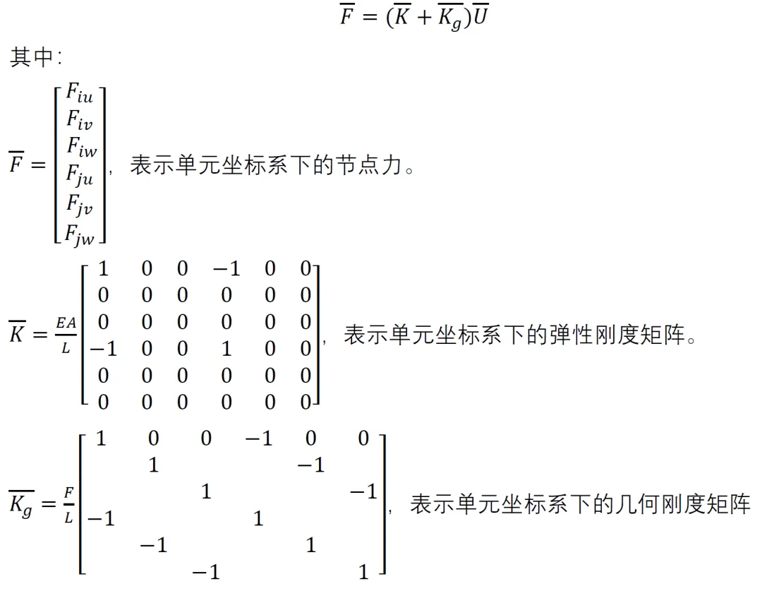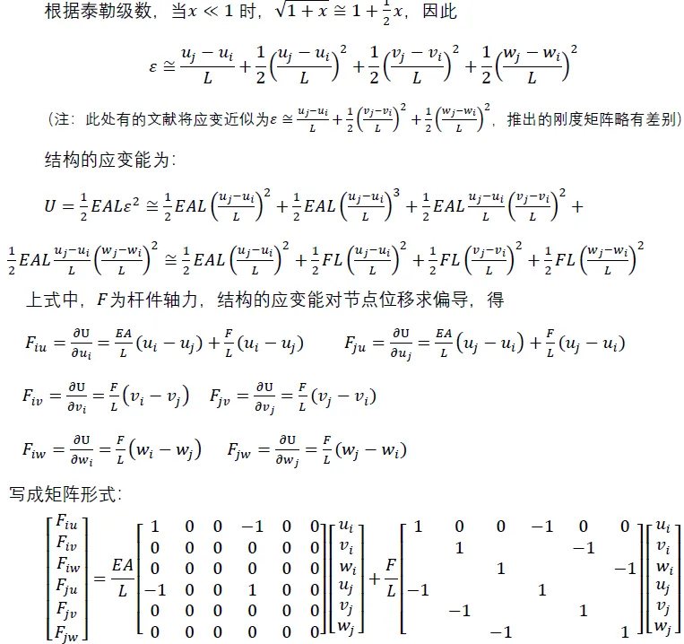 ,其中K为结构的弹性刚度矩阵,Kg为外荷载作用下几何刚度矩阵,λ为特征值,该行列式对应方程组的非零解为结构的屈曲模态。对上述公式很长一段时间一直是似懂非懂,后来经老师的指导才恍然大悟。本文对该公式推导一遍,以加强理解。结构最基本的静力平衡方程为F=KU,当结构轴力较大时,结构的几何刚度矩阵不可忽略,此时结构的刚度矩阵变为K+Kg,且Kg随轴力的变化而变化,因此结构的荷载位移曲线变为非线性。结构的平衡方程变为增量形式,即∆F=(K+Kg)∆U。随着外荷载的变化,会出现刚度矩阵的行列式等于零的特殊情况,即|K+Kg|=0。此时∆F=(K+Kg)∆U的解不唯一,有通解和特解,其中通解便是对应的屈曲模态。下文推导过程可知,Kg与轴力或外荷载成正比,因此计算时,先算出某一特定荷载下的几何刚度矩阵,然后几何刚度矩阵乘以系数λ便为特定荷载乘以λ对应的几何刚度矩阵,通过求临界λ,便可求出临界外荷载。因此特征值屈曲的方程变为|K+λKg|=0。跟弹性刚度矩阵一样,结构的几何刚度矩阵Kg也是由单元的几何刚度矩阵”对号入座”组装起来的。以下采用能量法,推导桁架单元的弹性刚度矩阵和几何刚度矩阵。如下图所示,空间桁架单元,i节点和j节点发生位移