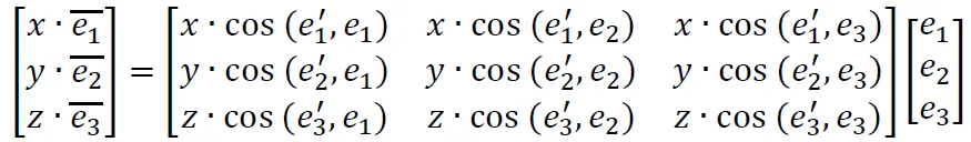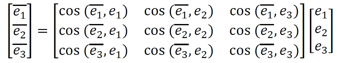一个结构中,各单元的单元坐标系一般不一致,无法直接组装成整体刚度矩阵,需通过坐标变换,将单元坐标系下的刚度矩阵转化为整体坐标系下的刚度矩阵。单元坐标系下的单位向量e与整体坐标系下单位向量e的关系如下:记为e=Te,T为坐标转换矩阵,且