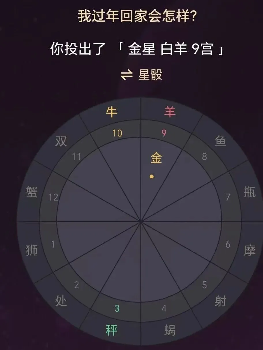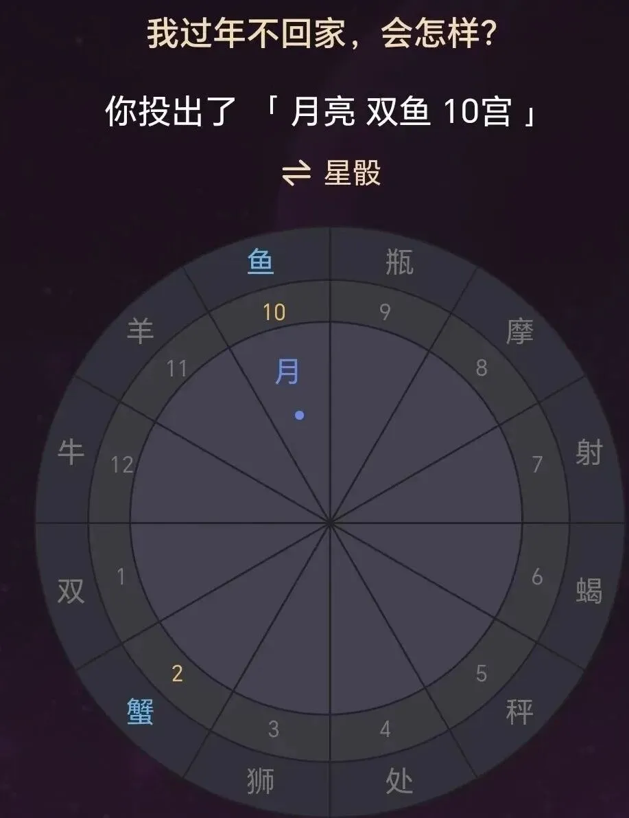 | 解读:1)月双鱼(月亮情绪深度+双鱼情绪广度),典型的随心所欲,发散状态,没人管;可能发散更多的时间在事业和学习上,去赚钱。容易在夜晚emo:在自由(10宫的独立需求)与来自家人,尤其是母亲的期待团圆(双鱼的共情)之间拉扯,需要分清“家人的情绪”和“我的情绪”之间的区别。2)处于“职业迷茫期”,独处时光能让月亮双鱼的灵性直觉发挥,帮助找到既满足情感需求(双鱼)又符合物质目标(2宫)的新方向。 | 解读:1)团圆:经过长途✈️ 回到老家和父母兄弟姐妹短暂的、热闹的团圆。2)相亲:谈及相亲话题容易耐心不足起冲突(白羊)。3)精神:激发个人信仰和传统观念的冲突,适合的伴侣类型,婚姻的意义,家庭价值等更深的思考。 |