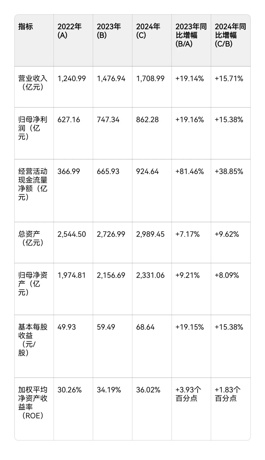 2024年,公司圆满完成了年度目标,营业总收入同比增长15.71%,达到1,709亿元;归属于上市公司股东的净利润同比增长15.38%,达到862亿元。