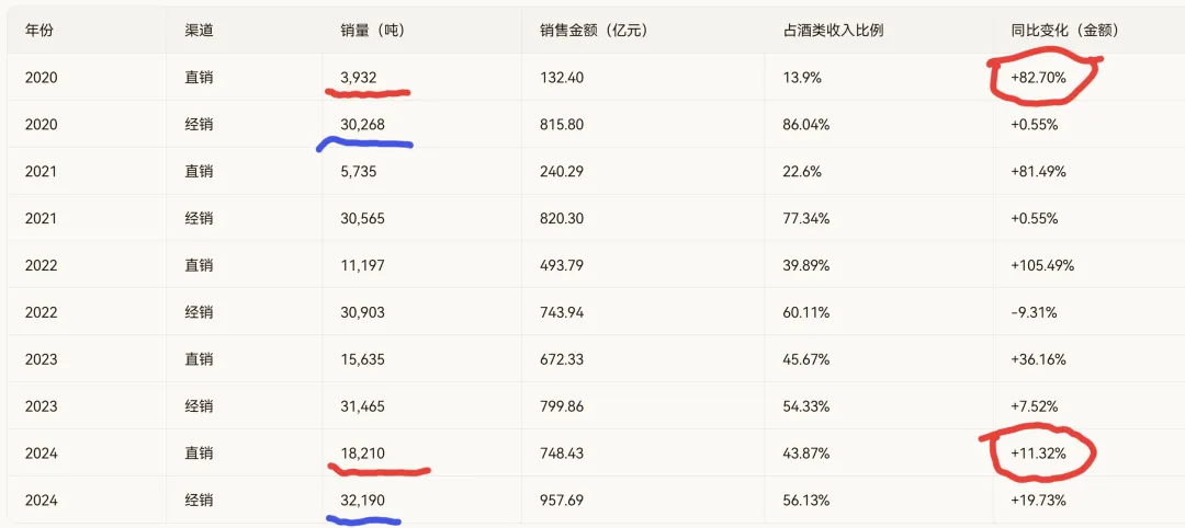 随着茅台基酒的不断释放,茅台一直在扩大直销渠道的销量,销量由2020年的3932吨,扩张到2024年的18210吨,增长了4.6倍。经销的销量几乎没有改变。综上可以看出茅台的大的经销方向;以经销为基石,发展直销渠道。直销的高毛利(2024年直销95.33% vs 经销89.42%),为后续的增长提供了想向空间。