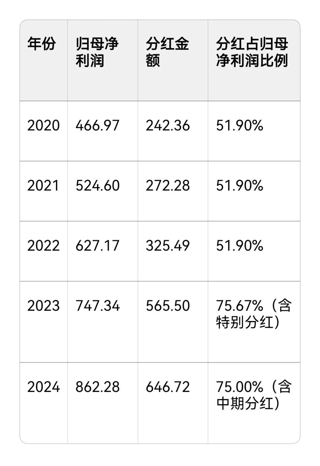 2024年,公司实施了2023年度末期分红(每10股派308.76元)和2024年中期分红(每10股派238.82元),2024年中期现金分红总额占当年归母净利润的比率达到40.21%,持续维持高分红政策。