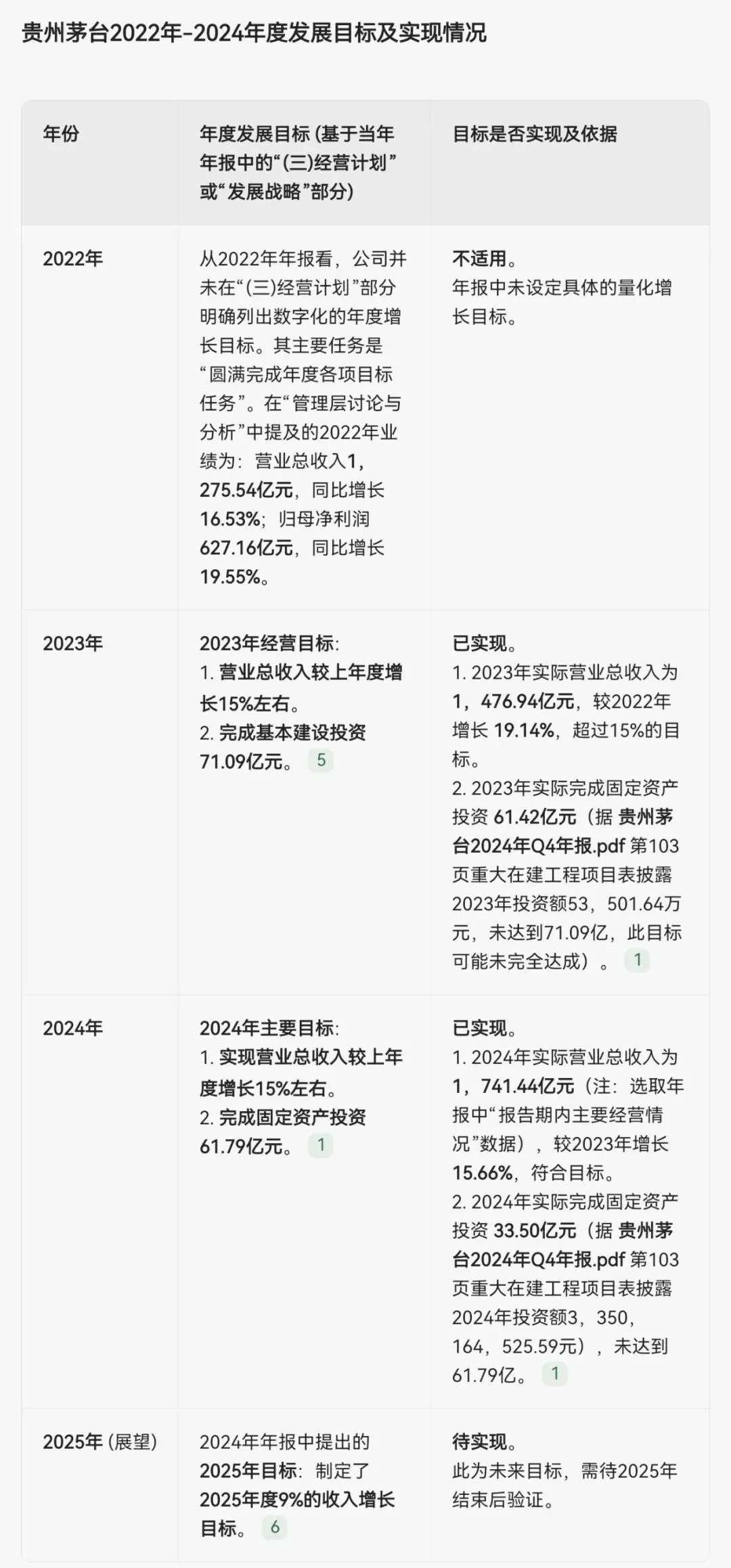 历年财报提到的经营目标已经基本实现,说明发展战略与诚信度是值得信赖的。茅台的生命就是质量,在质量为基石,产出的商品供不应求的情况下,低调稳健发展,这应该是企业最舒适的状态了吧!