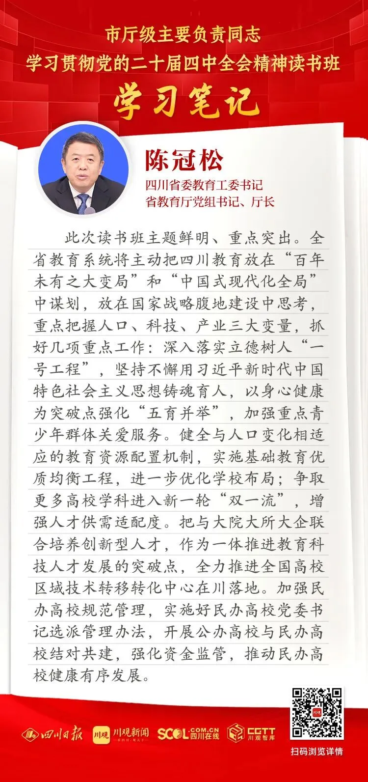 此次读书班主题鲜明、重点突出。全省教育系统将主动把四川教育放在“百年未有之大变局”和“中国式现代化全局”中谋划,放在国家战略腹地建设中思考,重点把握人口、科技、产业三大变量,抓好几项重点工作:深入落实立德树人“一号工程”,坚持不懈用习近平新时代中国特色社会主义思想铸魂育人,以身心健康为突破点强化“五育并举”,加强重点青少年群体关爱服务。健全与人口变化相适应的教育资源配置机制,实施基础教育优质均衡工程,进一步优化学校布局;争取更多高校学科进入新一轮“双一流”,增强人才供需适配度。把与大院大所大企联合培养创新型人才,作为一体推进教育科技人才发展的突破点,全力推进全国高校区域技术转移转化中心在川落地。加强民办高校规范管理,实施好民办高校党委书记选派管理办法,开展公办高校与民办高校结对共建,强化资金监管,推动民办高校健康有序发展。
