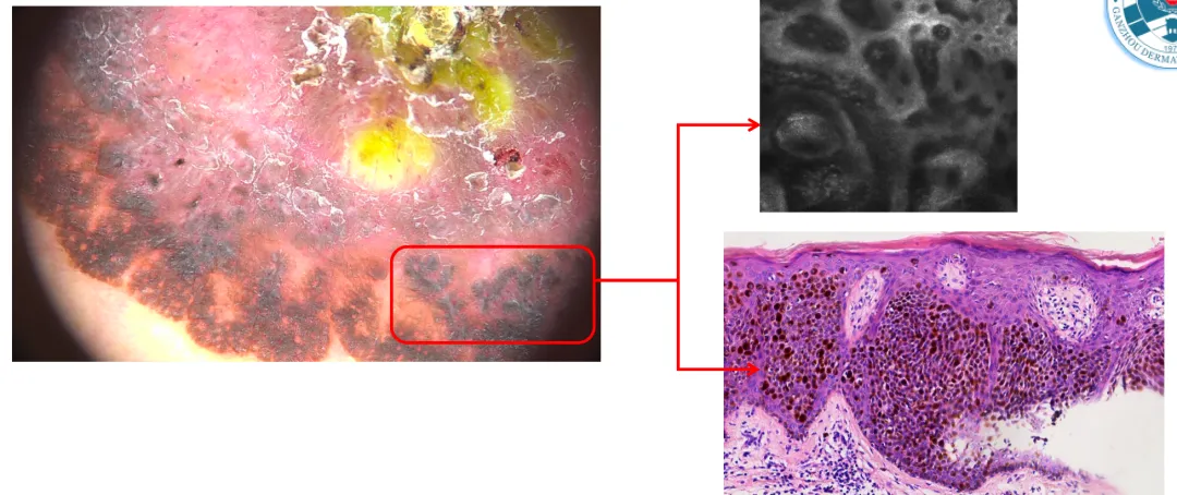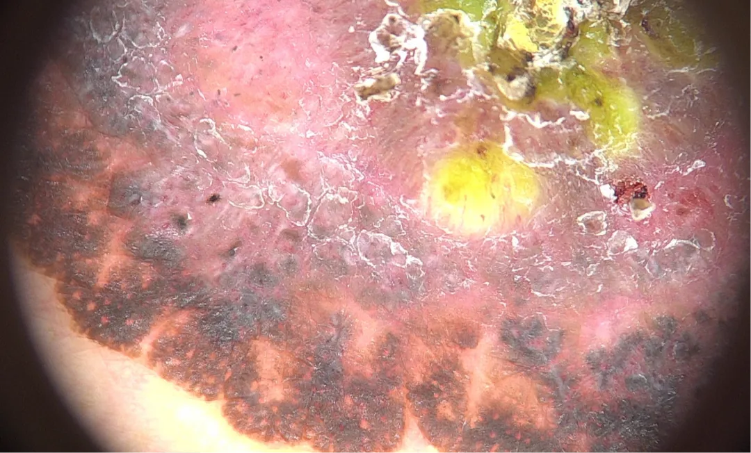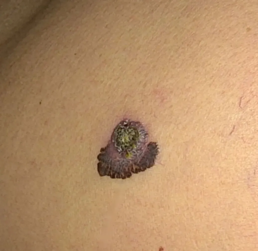 现病史:数年前患者右背部出现一黑色斑块,近年来斑块面积逐渐扩大,表面隆起,半年前斑块边缘处出现一结节,结节逐渐增大,出现破溃结痂。于2025年4月24日来我院就诊。