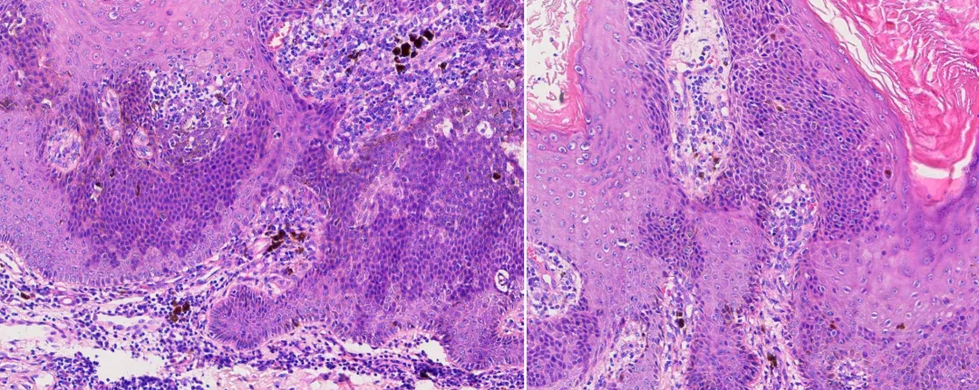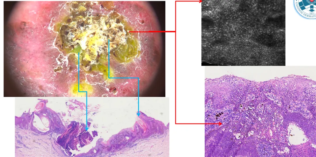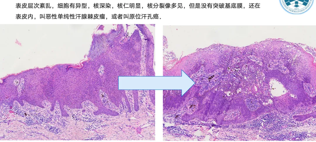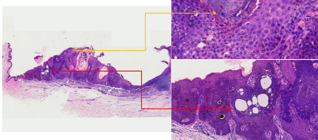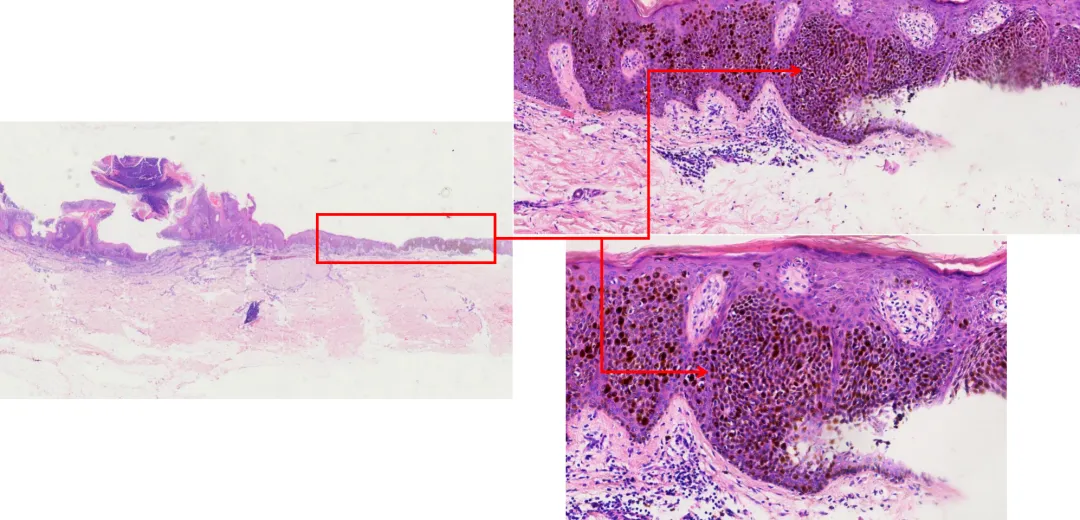 ③局部区域表皮全层紊乱,可见核分裂像及细胞异型性。