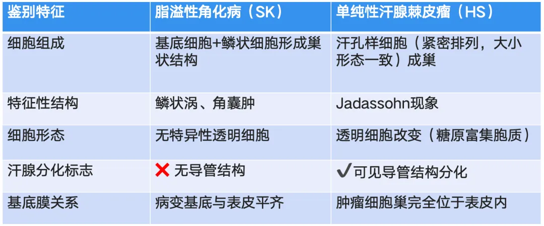 ①单纯性汗腺棘皮瘤(HS)是小汗腺汗孔瘤(EP)四种亚型中较为罕见的一类,其恶变概率较低(恶性转化率达10%)。