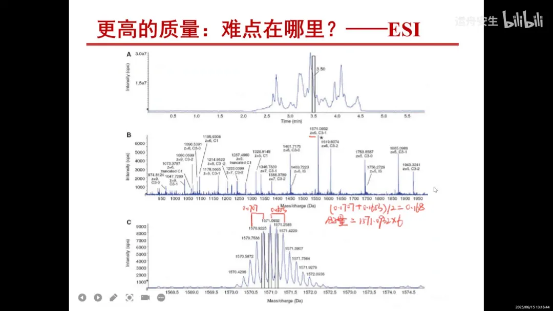ESI的挑战:ESI会形成多电荷离子,导致高质量端的谱图变得复杂。随着颗粒质量的增加,其表面积增大,带电量也会增加,使得质荷比被大大缩小,同位素分布被严重压缩,这对质谱仪器的分辨率提出了更高的要求。此外,ESI对大分子的容忍度也不如MALDI高,因此当分子量越来越大时,难度也会越来越大。