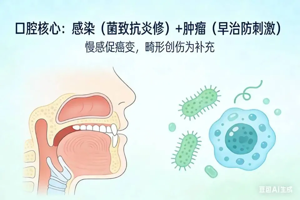 2. 关键关联性:慢性感染(如牙周炎、残根刺激)→ 长期黏膜刺激→ 异常增生→ 癌变风险升高