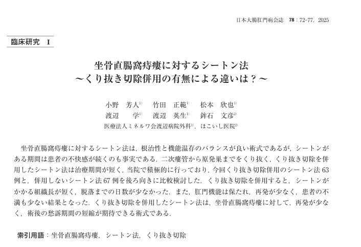 坐骨直肠窝痔瘘因其原发灶位置深在,手术治疗需在根治性与肛门功能保护之间寻求最佳平衡。Seton(挂线)术式通过橡胶条渐进式切割组织,兼具开放术的根治优势与括约肌保护特点,但仍存在术后不适周期长、患者体验欠佳的问题。为优化疗程,日本渡边病院团队提出在Seton术中联合 “瘘管剜除术”(core excision procedure),并于2025年在《日本大腸肛門病会誌》发表了一项回顾性对照研究,系统比较该联合术式与单纯Seton术的临床效果。本文将对该研究进行系统梳理与解读。